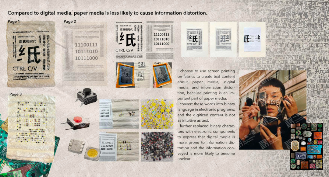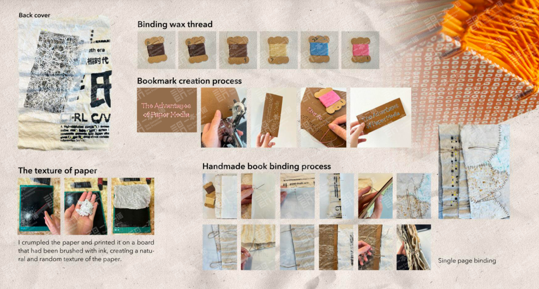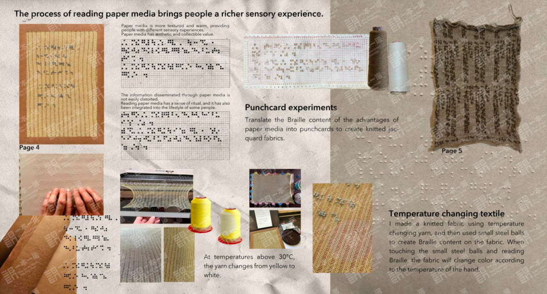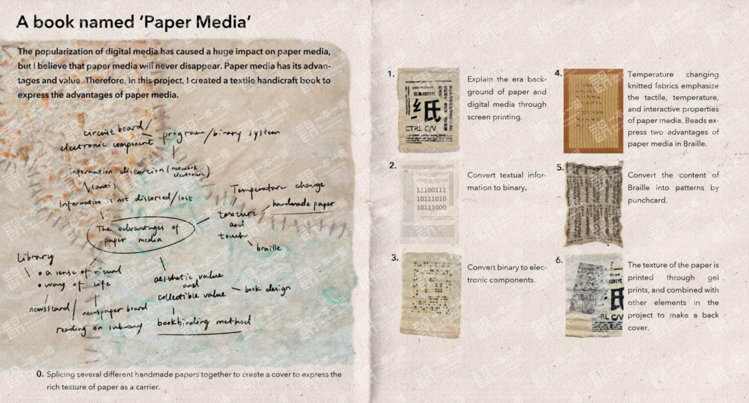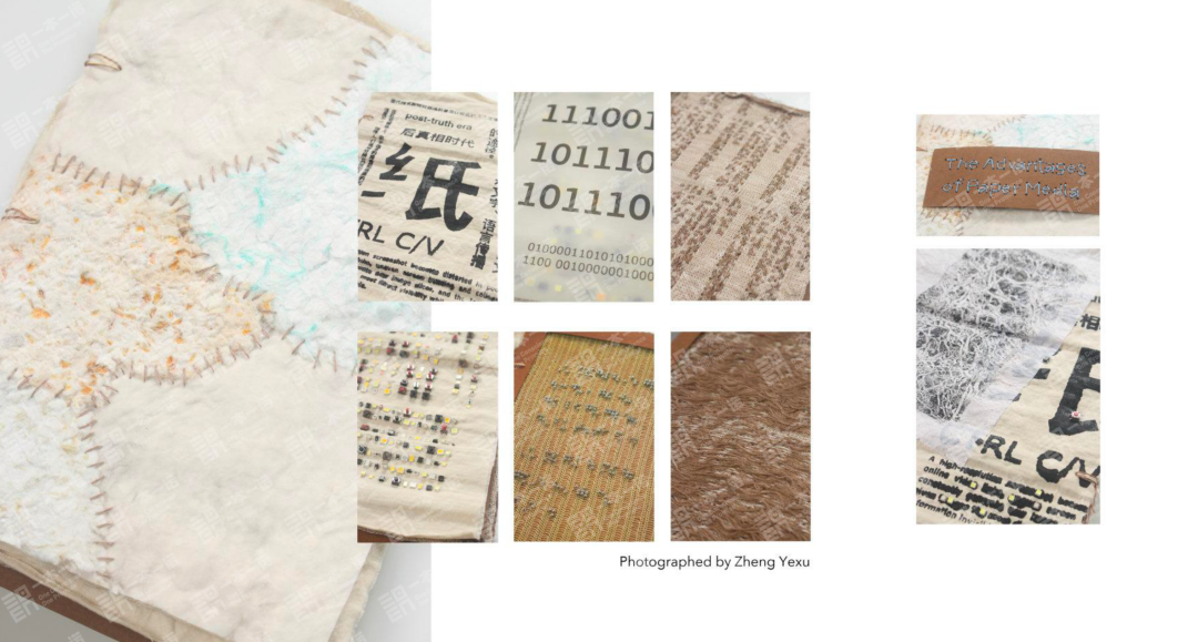 项目《A Book Named ‘Paper Media'》在数字媒体普及对纸媒造成巨大冲击的当下,我相信纸质媒体不会因此消失。在这个项目中,我创作了一本纺织工艺品书来探索纸质媒体的优势和价值我觉得面料设计是一个包容性很强的专业,它可以探索和解决目前纺织品相关所面对的实际问题,可以是很实用性、技术性的。作为艺术设计中的一部分,它也可以给人们提供情绪价值,作为一种传达和交流的媒介。项目《A Book Named ‘Paper Media'》过程